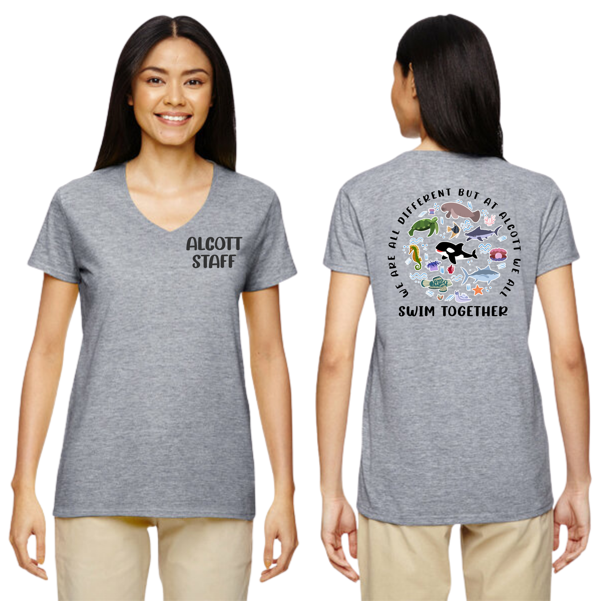 The women's fitted v-neck shirts are made of 100% ring-spun cotton (sport gray is a polyester and cotton blend) and come in three colors: black, white, and sport gray.
